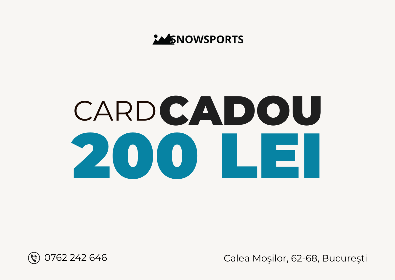 Card CADOU 200 - este solutia ideala pentru momentele in cand vrei sa faci o surpriza unei persoane dragi. Voucher-ul este un cupon cu valoare emis de SnowSports si poate fi folosit pentru achizitionarea de produse sportive. Cardul poate fi cumparat din showroom-ul de pe Calea Mosilor nr. 62-68 si de pe SnowSports.ro.